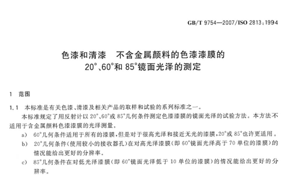 在国家标准GB/T9754-2007中,对于色漆、清漆、不含金属颜料的色漆漆膜等的光泽度提出了明确的判定方法,以20°、60°或85°几何条件来测定。20°、60°、85°三个测量角度是指与被测物表面垂直的法线与入射光束的夹角。60°适用于所有漆膜,20°更适合高光泽漆膜,即60°镜面光泽度高于70单位的漆膜,85°适用于低光泽漆膜,即60°镜面光泽低于10单位的漆膜。一般而言,可用60°的通用角度测量油漆。