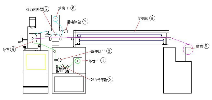 烘箱长度约 1.8 米(节灯箱两面 UV 灯固化,可调节 UV 光强度,有复合功能(涂布头处复合),光源 UV 冷光(可自配)